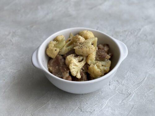 やわらかく蒸したスペアリブに、カリフラワーの香ばしさと韓国唐辛子のほどよい辛味が加わった、さっぱりとした煮込み料理です。