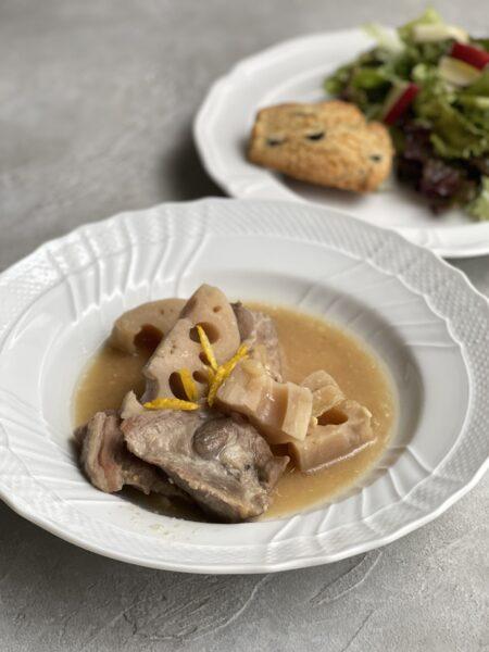 タイムとローズマリーを加えて焼いたのですが、合わせた料理が豚肉と蓮根の味噌煮込み。