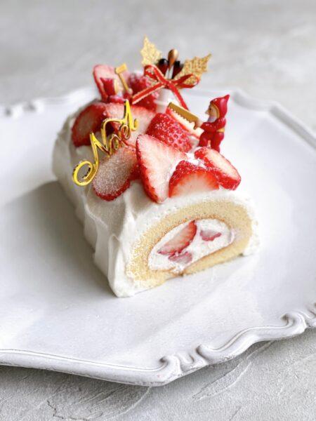 米粉で作る、しっとりふわふわのスポンジ生地にホイップクリームとフレッシュいちごを巻き込んだ小さなブッシュドノエルのレッスンをお届けします。