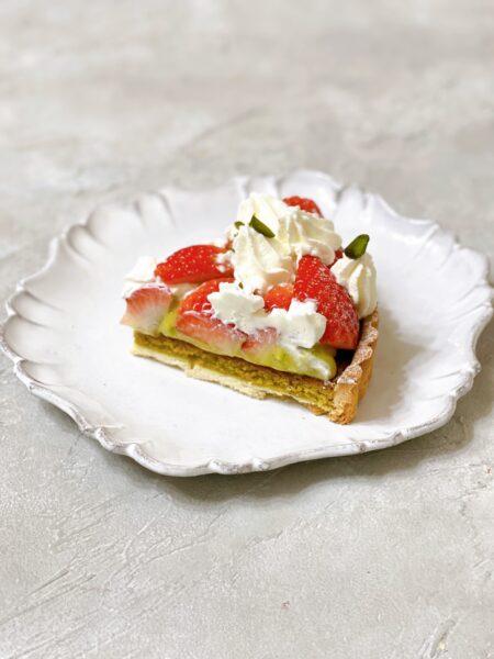 タルト生地にピスタチオのアーモンドクリーム、その上にピスタチオのカスタードクリームを流してたっぷりのいちごとホイップクリームをのせた、贅沢なタルト。
