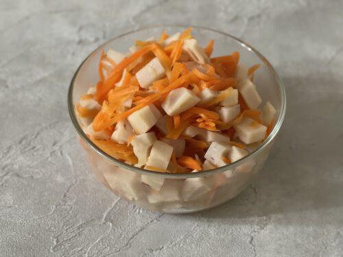 蓮根のコリコリとした歯応えと、しりしりにしたにんじんの甘さを、ホワイトバルサミコのまろやかな酸味でまとめました。