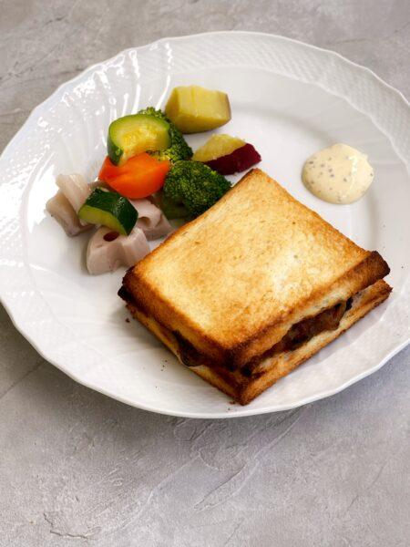 今回は豚肉をデミグラスソースで軽く煮て、食パンで挟んでトーストしました。