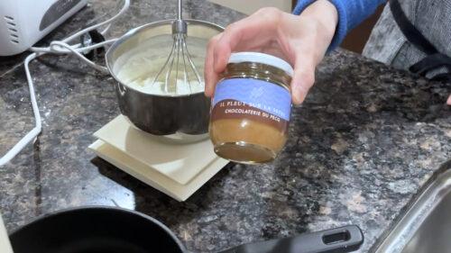 チョコレートのカスタードに、クレームダマンドの材料を加えるとリッチなアパレイユを作ります。