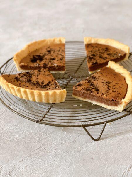空焼きしたパイ生地に流し入れ、コーヒー豆を挽いたものを散らして焼きました。
