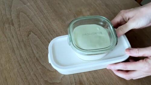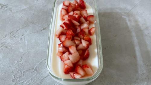 この容器はデザート作りにもぴったりで、ふたも付いているので、そのまま冷蔵庫で保存できるのも便利です。